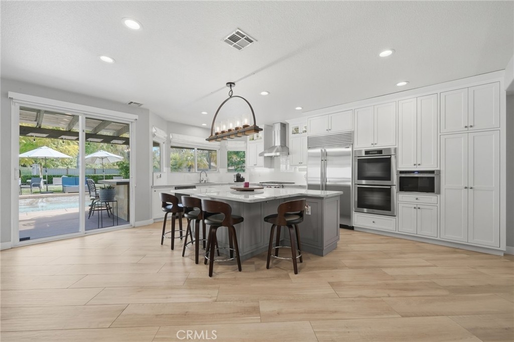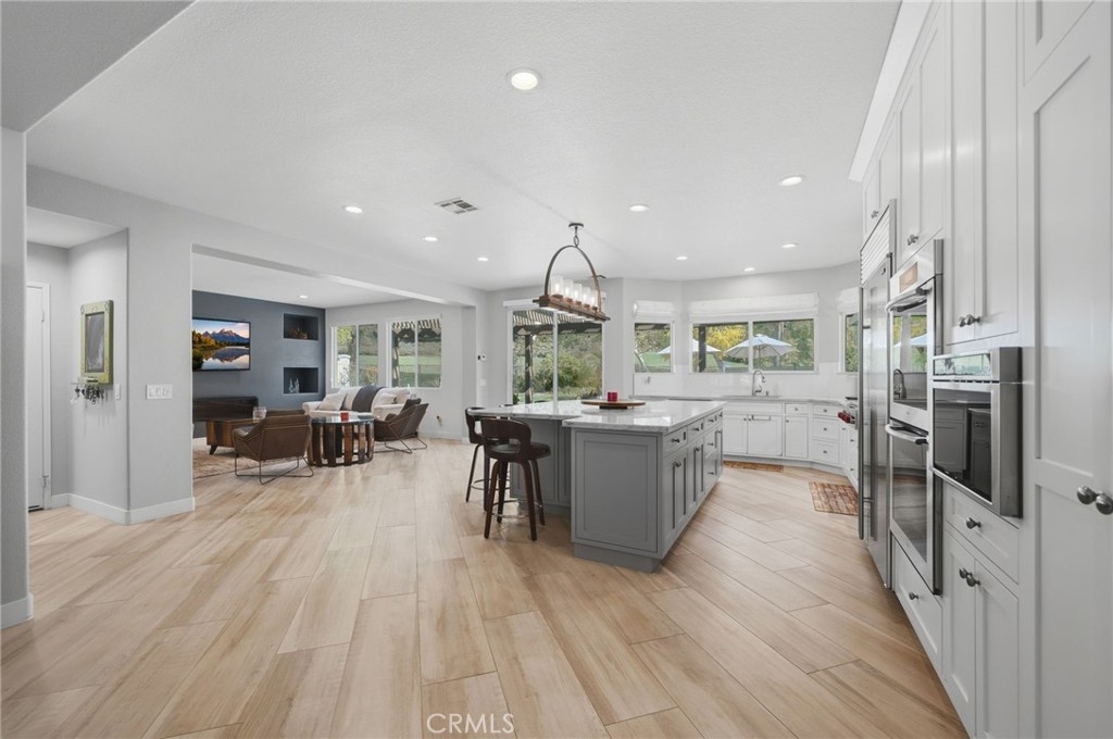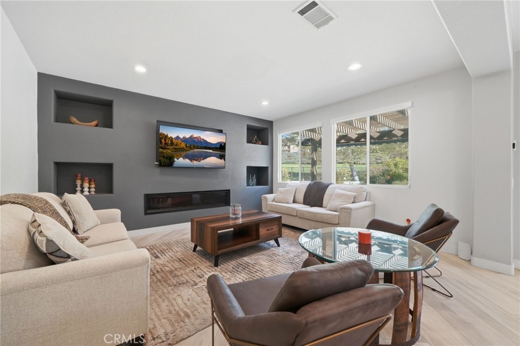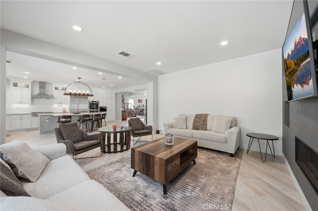 Inside, a redesigned floor plan creates an open concept living and entertaining space with a focus on both functionality and flow. The kitchen is beautifully appointed with custom cabinetry, quartz countertops, and a suite of premium appliances, including Sub-Zero, Wolf, and Miele. The adjacent family room features a sleek linear fireplace, illuminated built-ins, and integrated media, offering a space that is both elevated and comfortable.