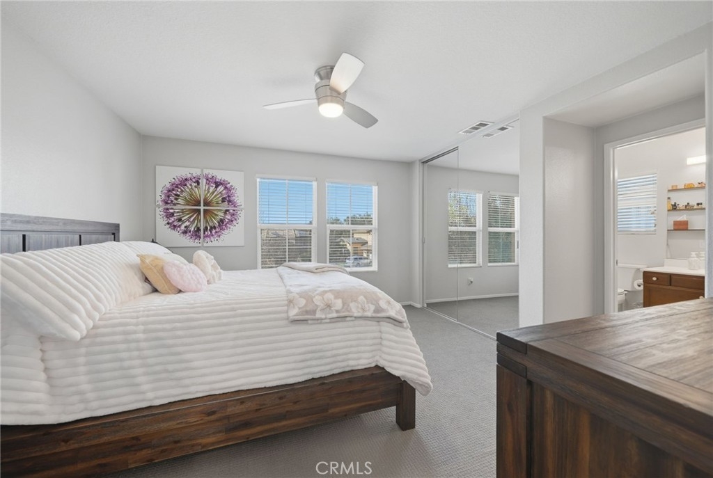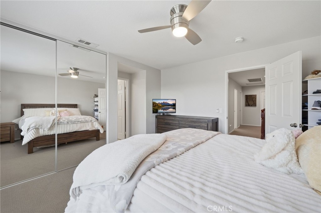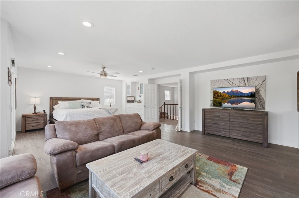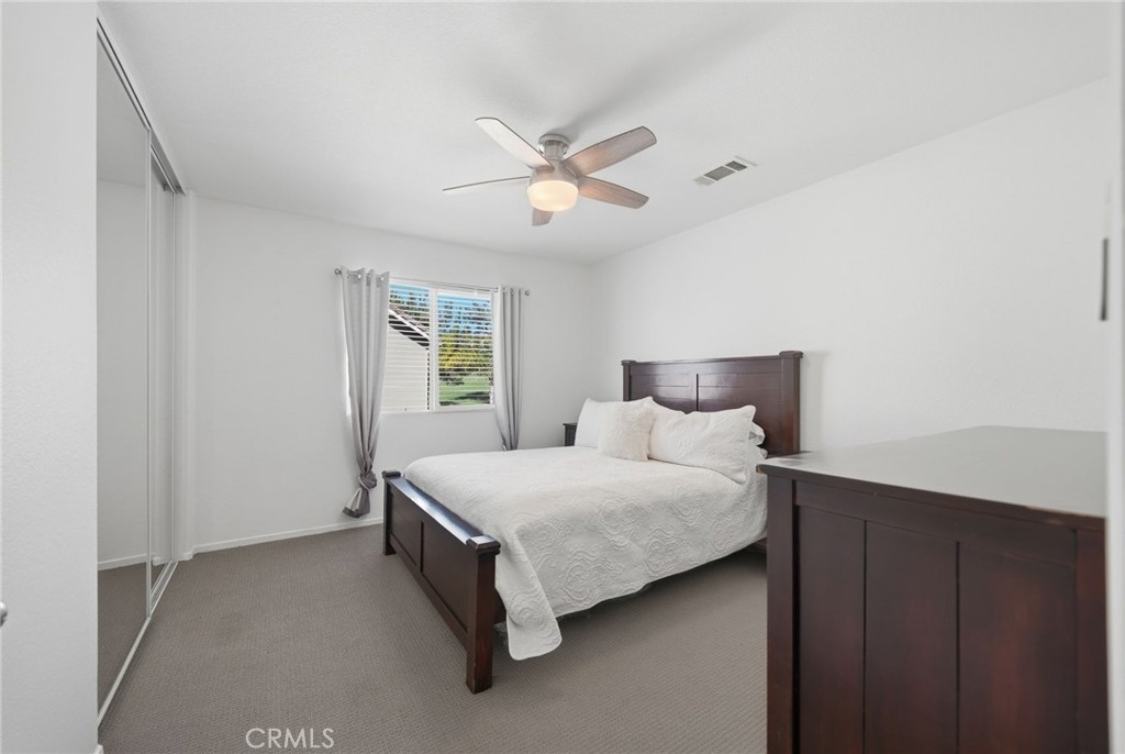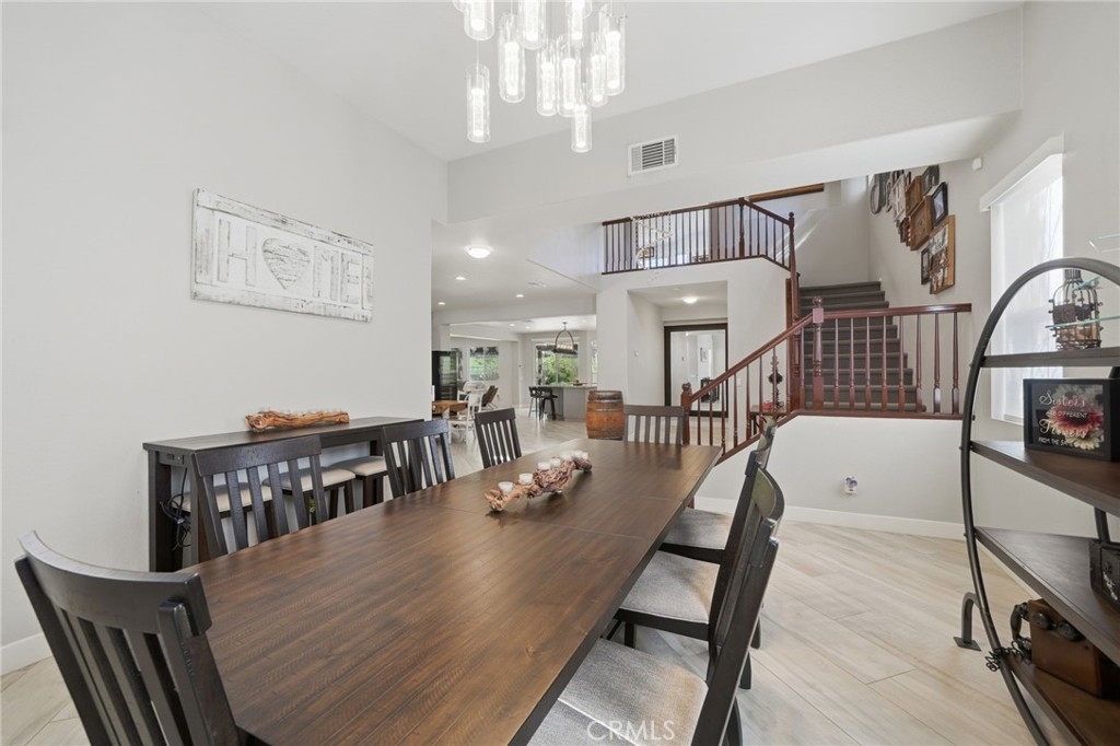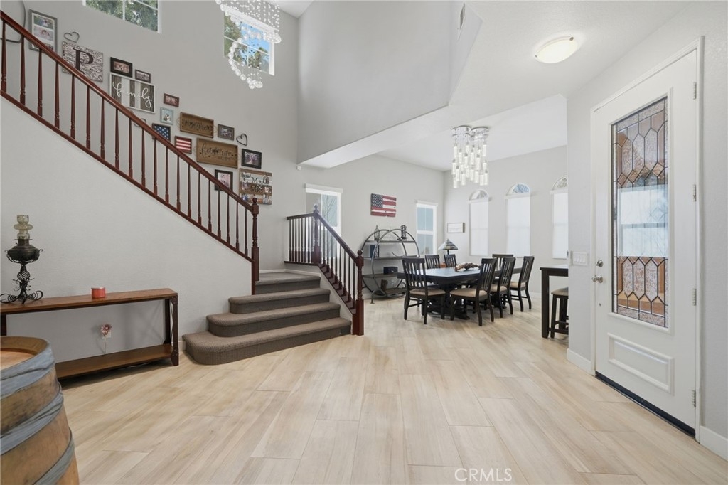 Additional highlights include dual staircases, a whole-house fan, fully paid solar (8.36 kW, 22 panels), and a three-car tandem garage with epoxy flooring and overhead storage. An interior laundry room provides added functionality with generous storage and workspace.