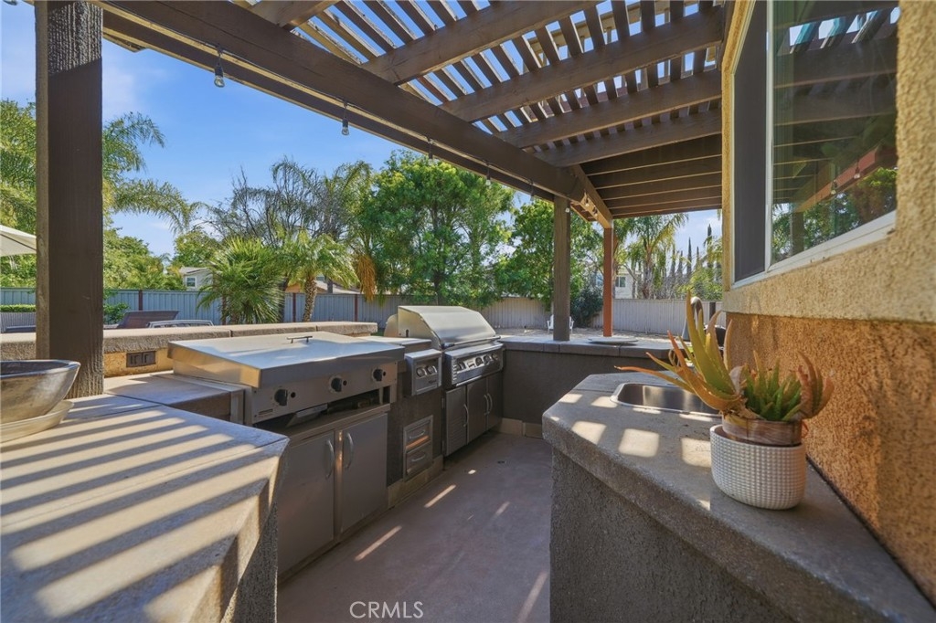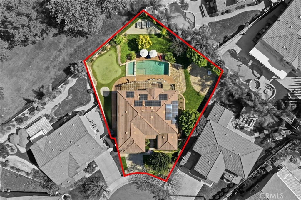 The backyard is designed as a private retreat, ideal for both entertaining and everyday enjoyment. A custom putting green with sand trap, outdoor kitchen with built-in BBQ and bar seating, and an oversized fire feature create a resort-style setting. Mature fruit trees, including orange, apple, and lemon, along with thoughtfully placed landscape lighting, add both charm and ambiance.