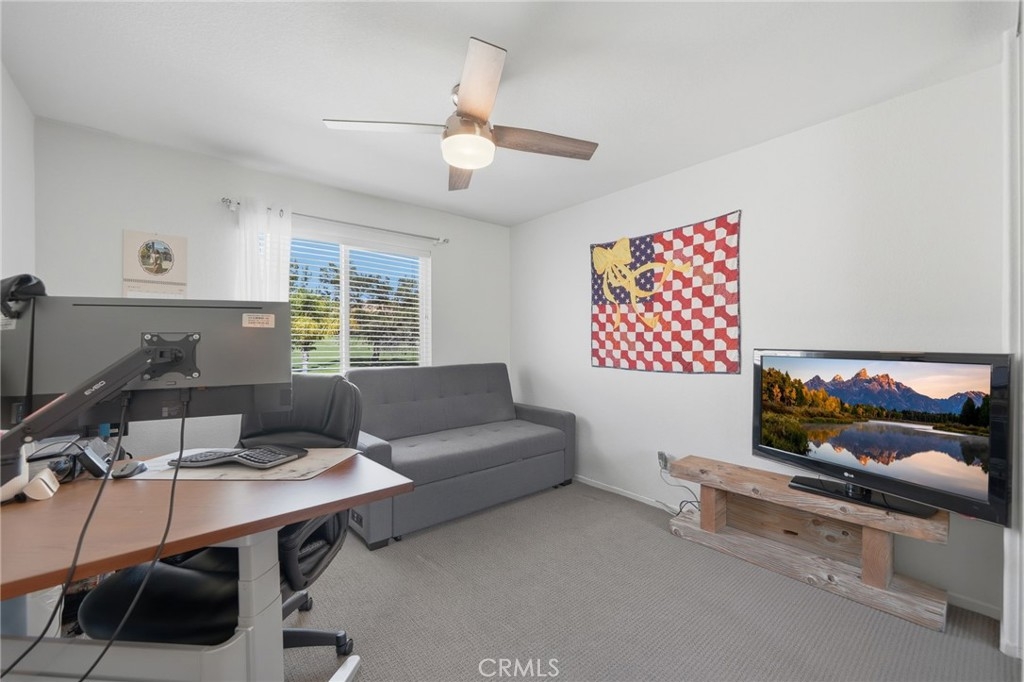 The main level includes a private office and powder room, with the office offering flexibility to serve as an additional bedroom. Upstairs, the primary suite offers a peaceful retreat with hardwood flooring, a custom built-in dresser, and a private balcony overlooking the golf course. The spa-inspired primary bath features dual vanities, a walk-in shower, and a spacious custom closet. Secondary bedrooms are well-appointed with custom closet systems and ceiling fans, with one bedroom offering its own en suite bath, ideal for guests or multigenerational living. An additional upstairs bonus room offers flexible space for a media lounge, game room, or playroom.