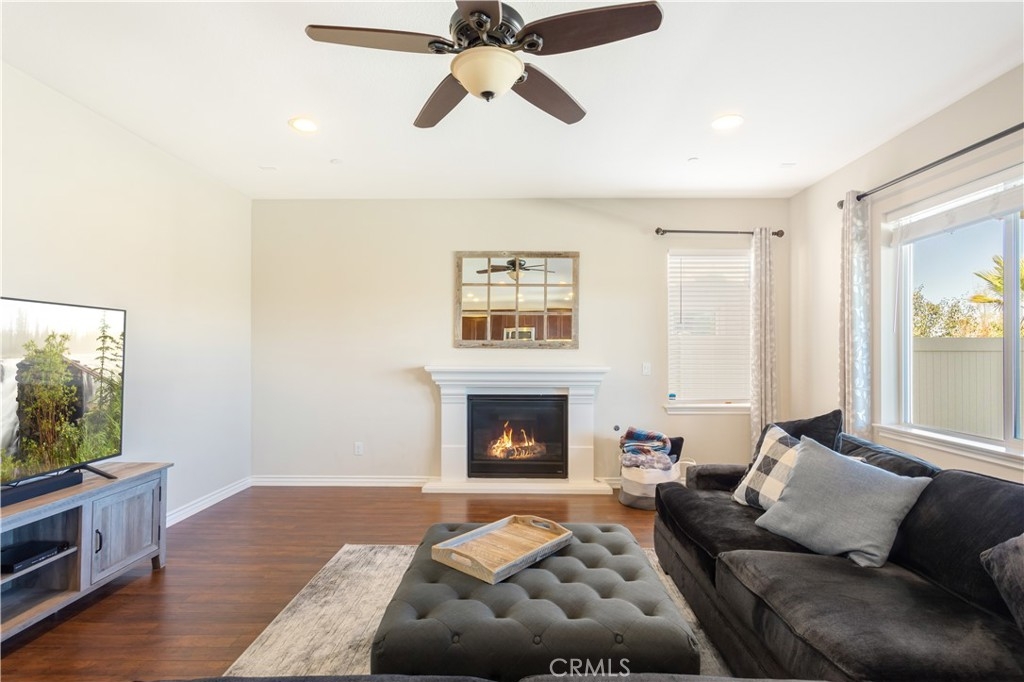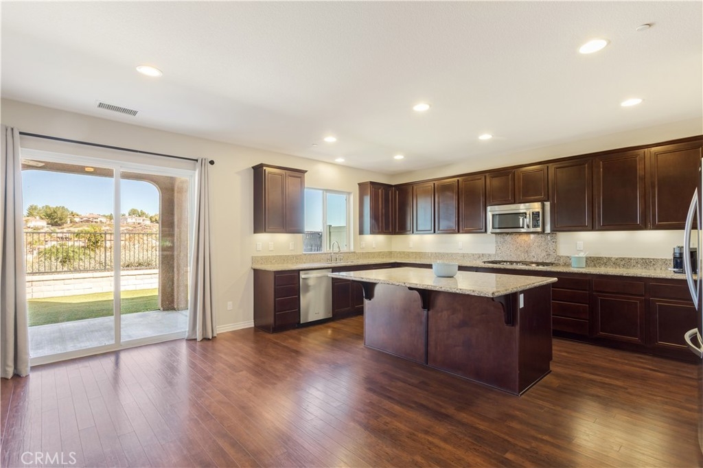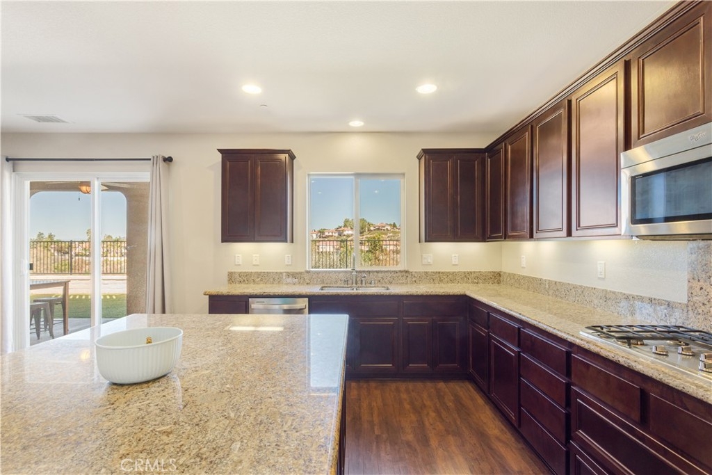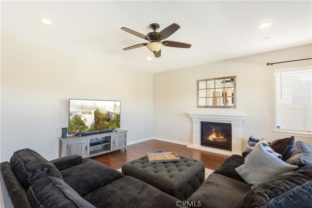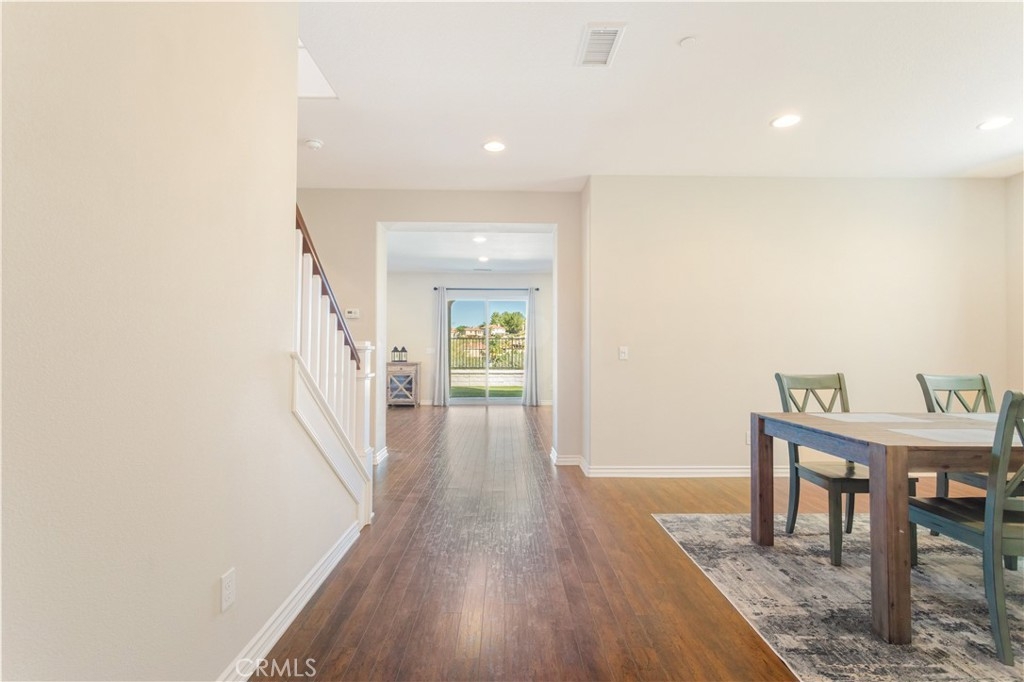 Welcome home to this four bedroom and three full bath home located in the desirable part of South Temecula with Golf Course Views!! The home sits on a quiet cul-de-sac and feels brand new with the amount of pride of ownership that this home has. The open floor plan features wood flooring throughout the whole downstairs and leads past the formal living and dining room to the spacious eat-in kitchen with an oversized center island, breakfast bar, granite countertops, loads of cabinets for storage, walk-in pantry, and stainless steel appliances. There is additional space between the kitchen and family room to fit a full sized dining table ideal for entertaining family and friends. From the kitchen enter the backyard through the sliding glass door to the covered patio with ceiling fans and lights with a breathtaking view of the Redhawk Golf Course and beautiful mountains in the distance. Back inside and upstairs is the primary bedroom featuring a balcony to enjoy those stunning SoCal sunsets and an attached primary bathroom with a separate soaking tub and shower surround, dual sinks with a center vanity, and dual walk in closets. All the remaining bedrooms are upstairs and share a hallway bathroom. Some other features of the home include a 3 car garage with polished floors, water filtration system, updated vinyl fencing surrounding the property, and an upstairs laundry room with a sink. With an ideal location close to local parks and award winning Temecula schools including Great Oak High School, shopping, restaurants, Temecula Wine Country, Pechanga Resort & Casino, and quick freeway access this home is a must see!
